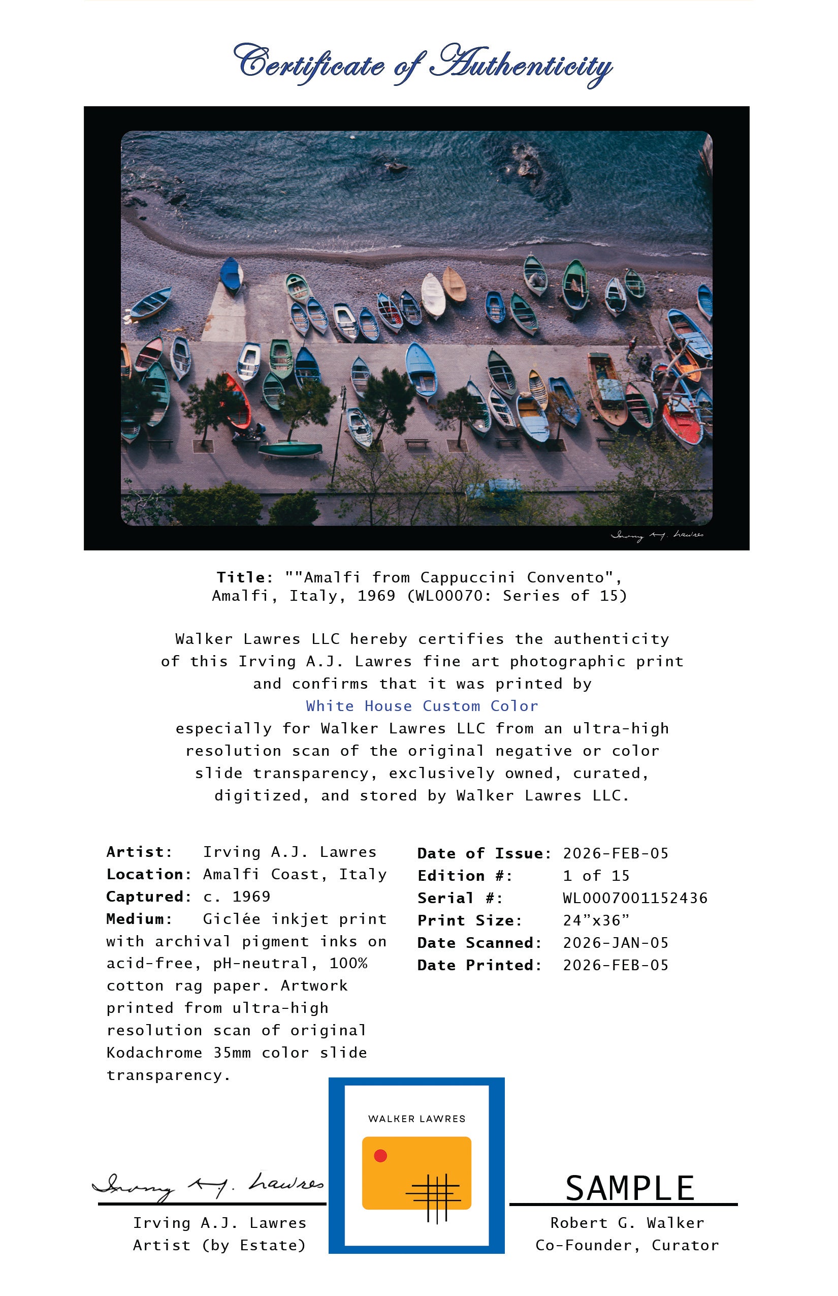 Limited Edition Collector Print on fine art paper from high-resolution scan of original Kodachrome 35mm color slide. Formatted to maintain original slide aspect ratio. Limited Edition prints are restricted to a small, total quantity across all sizes offered. Once an edition is sold out, it will be permanently archived. Each Limited Edition print is embossed with Irving A.J. Lawres' signature and hand numbered on recto, estate signed and stamped on verso, and includes a signed Certificate of Authenticity with an image of the original 35mm slide.