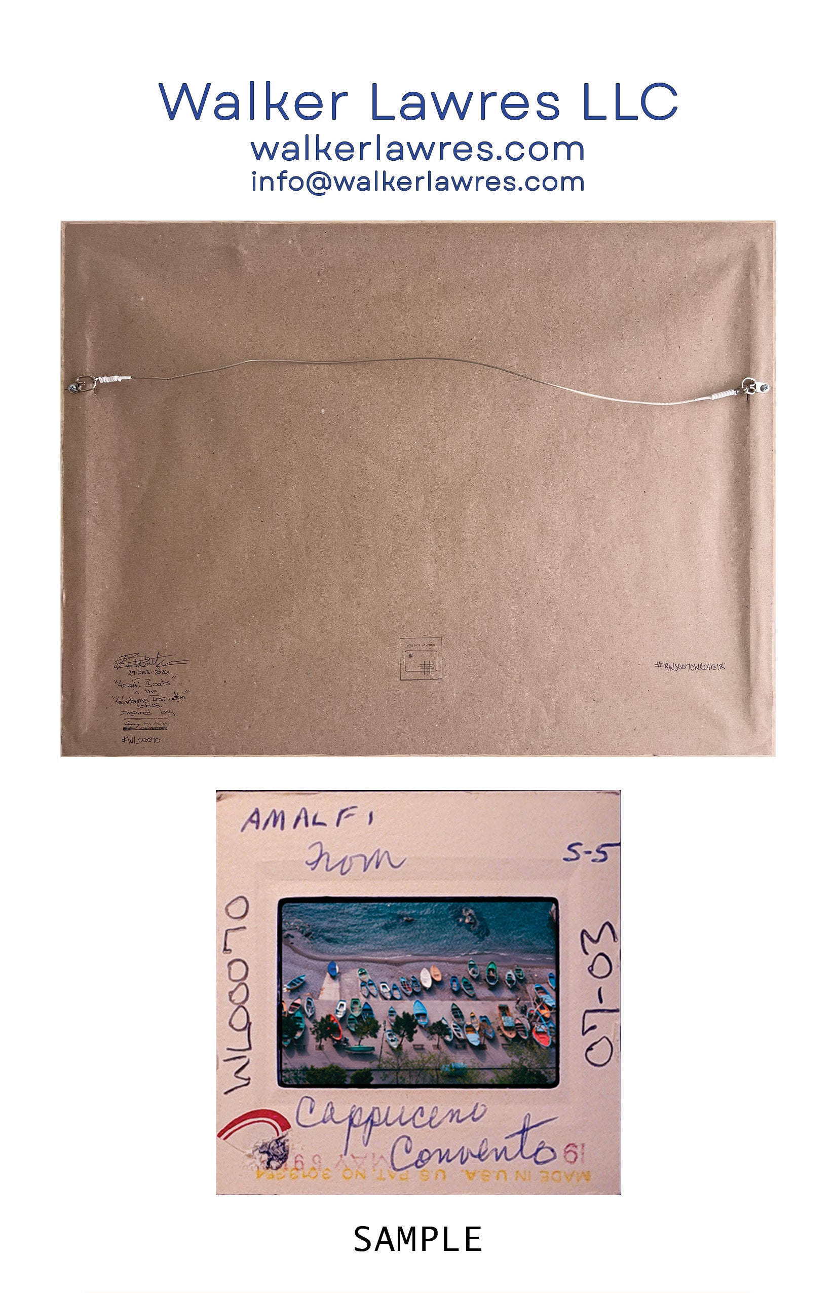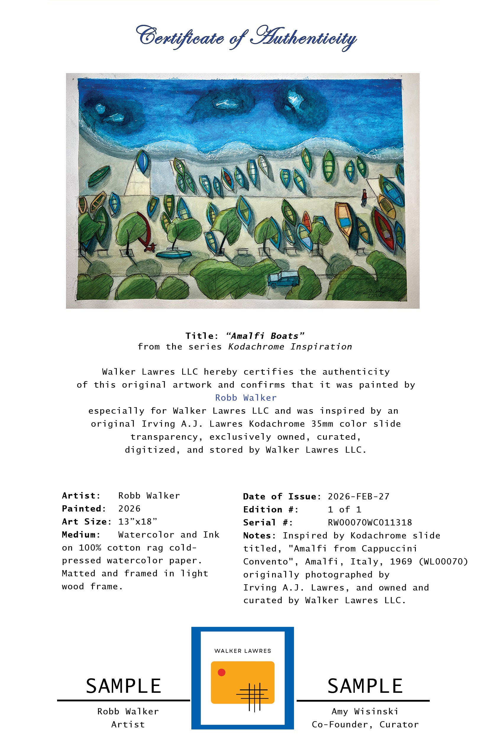 Completed in early 2026, "Amalfi Boats" is an original ink and watercolor painting by Robb Walker from his "Kodachrome Inspiration" series. It is painted on Arches Aquarelle 100% cotton rag paper. It was inspired by Irving Lawres’ 1969 photograph of boats along the waterfront in Amalfi, Italy.