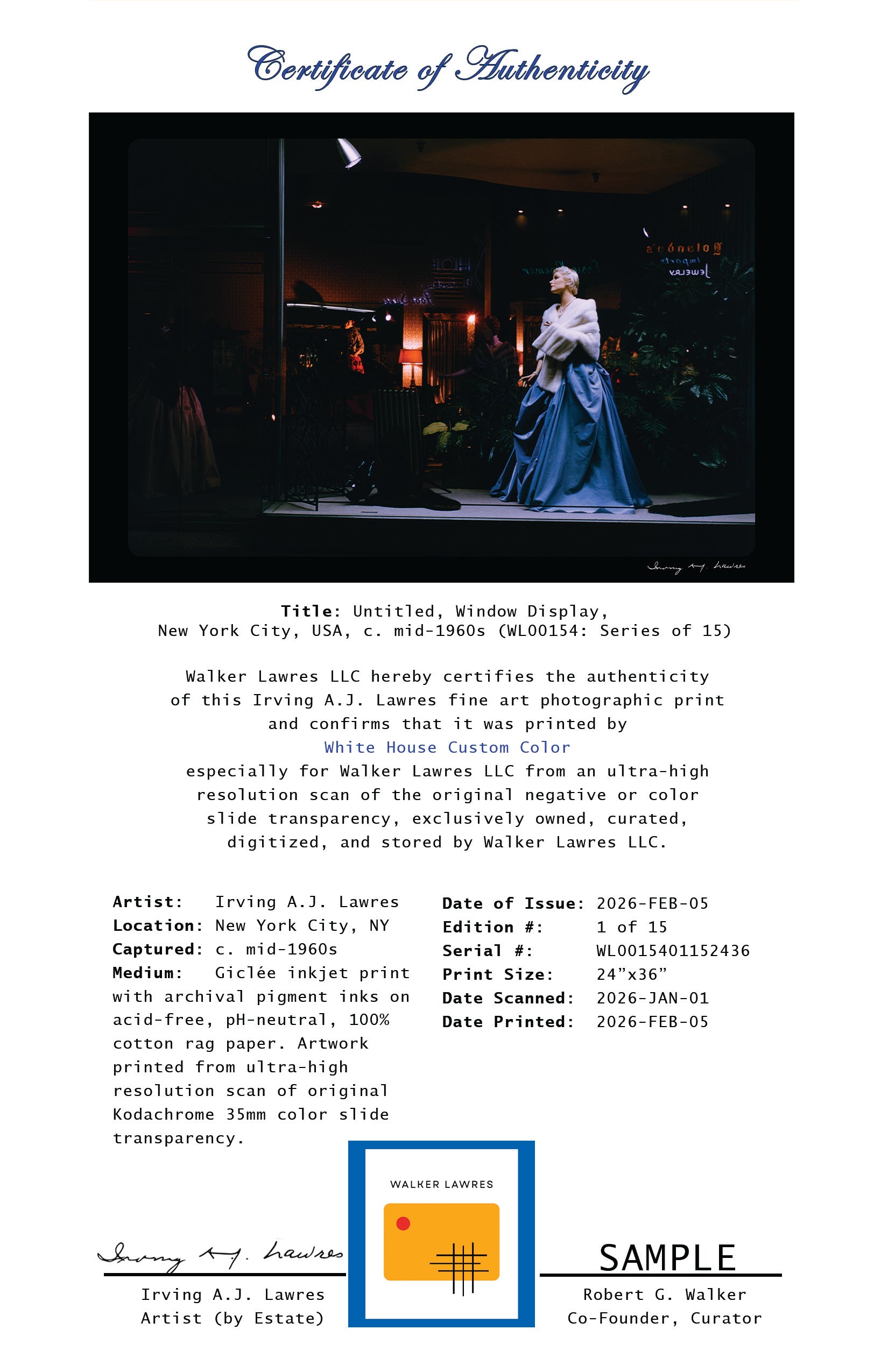 Limited Edition Collector Print on fine art paper from high-resolution scan of original Kodachrome 35mm color slide. Formatted to maintain original slide aspect ratio. Limited Edition prints are restricted to a small, total quantity across all sizes offered. Once an edition is sold out, it will be permanently archived. Each Limited Edition print is embossed with Irving A.J. Lawres' signature and hand numbered on recto, estate signed and stamped on verso, and includes a signed Certificate of Authenticity with an image of the original 35mm slide.